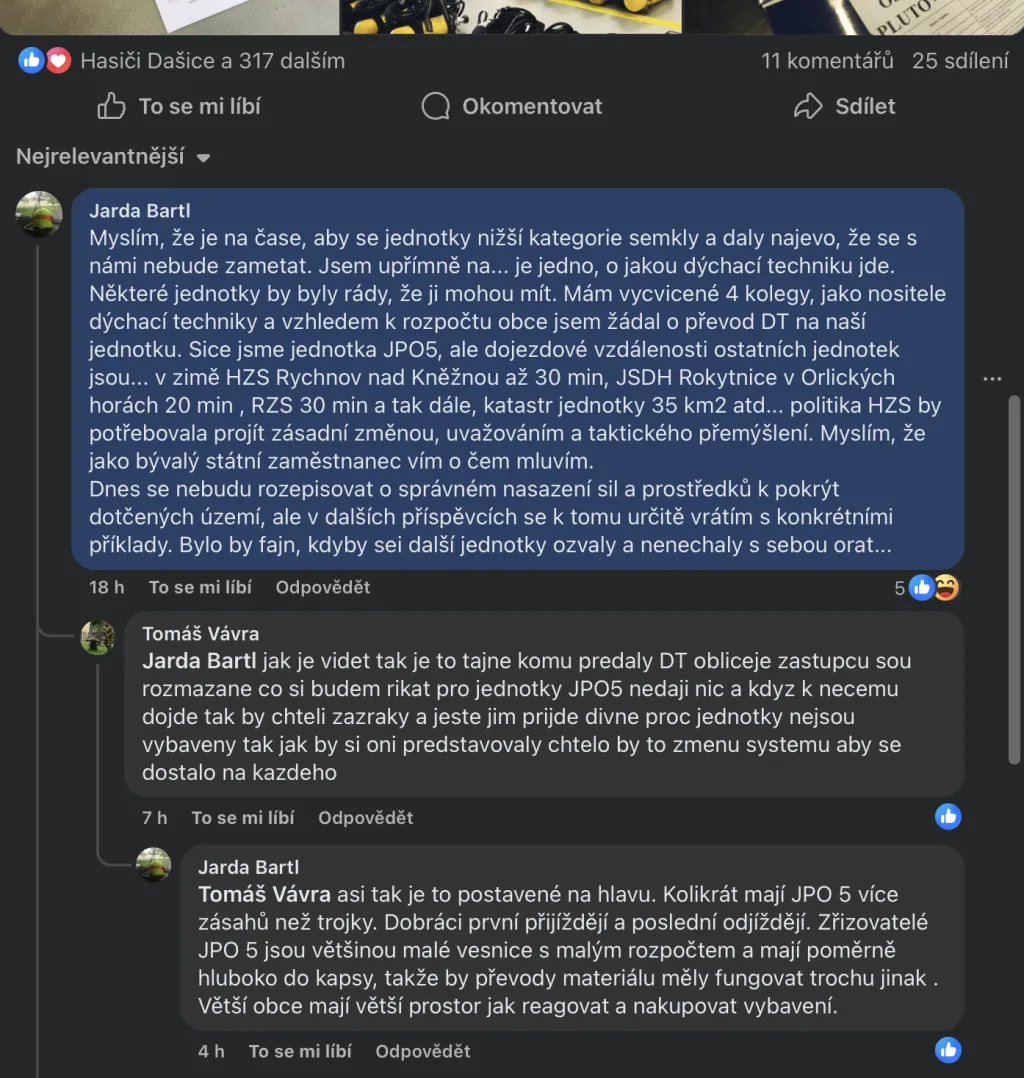 „Myslím, že je na čase, aby se jednotky nižší kategorie semkly a daly najevo, že se s námi nebude zametat,“ uvedl ostře Bartl. Popisuje situaci, kdy má v jednotce vycvičené nositele dýchací techniky, ale kvůli rozpočtu obce na vlastní vybavení nedosáhnou a o převod žádal marně. „Je jedno, o jakou dýchací techniku jde. Některé jednotky by byly rády, že ji mohou mít. Mám vycvičené čtyři kolegy, jako nositele dýchací techniky a vzhledem k rozpočtu obce jsem žádal o převod dýchací techniky na naší jednotku,” napsal velitel dobráků.
