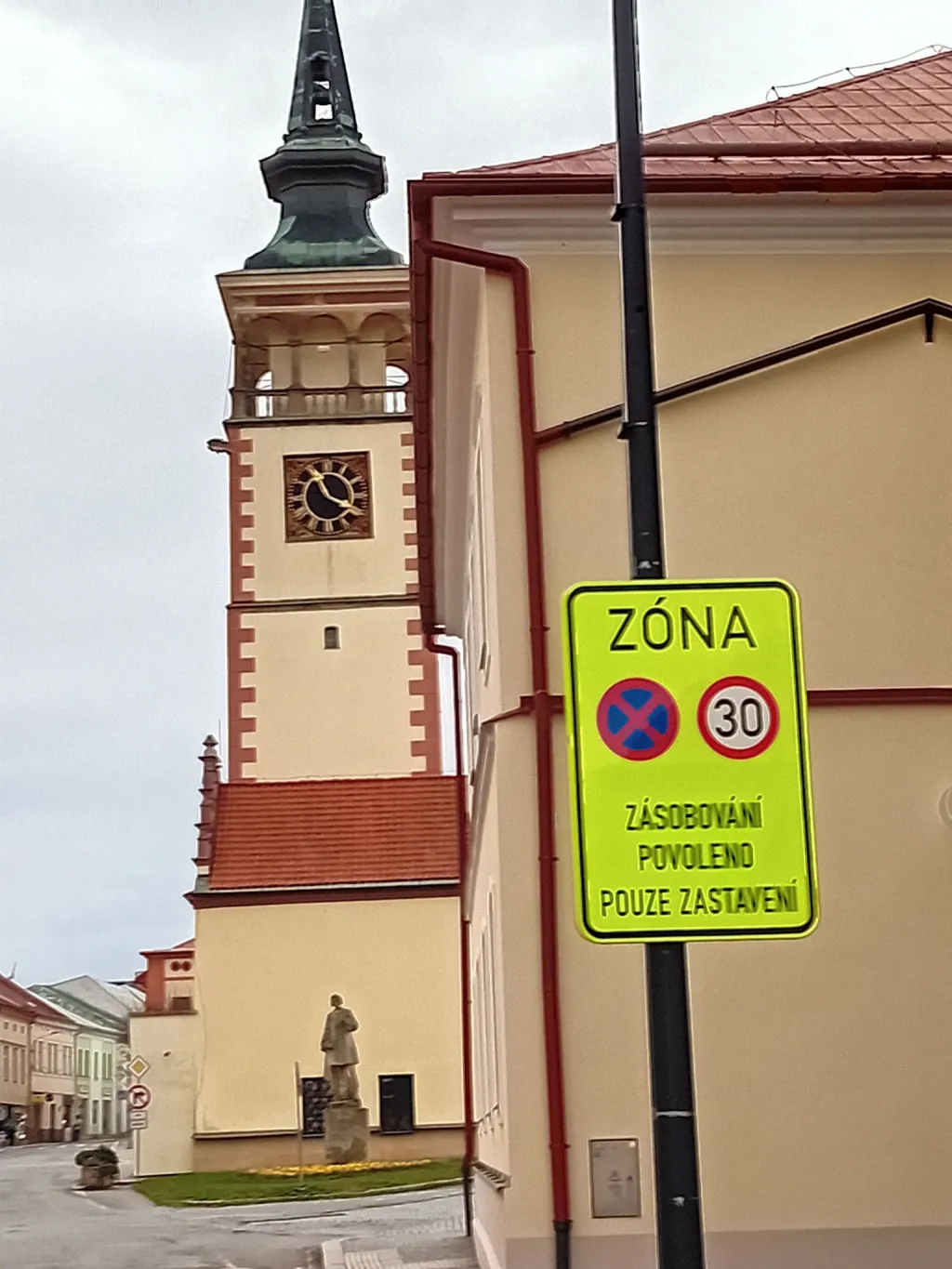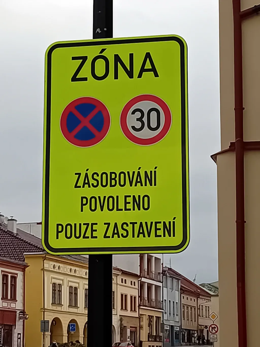 Instalované dopravní značky IZ 8a „Zóna s dopravním omezením“ jsou nově provedeny na výrazném fluorescenčním žlutozeleném podkladu, což zvyšuje jejich viditelnost na pozadí historické zástavby náměstí. Na tabuli je jasně vyobrazen symbol nejvyšší dovolené rychlosti 30 km/h a symbol zákazu zastavení. Dodatkový text na značce pak přesně specifikuje, že pro vozidla zásobování je povoleno výhradně zastavení. Významová stránka omezení zůstává podle informací z radnice i reakcí místních obyvatel stejná jako v minulosti, primárním záměrem bylo učinit pravidla pro projíždějící řidiče zřetelnějšími.