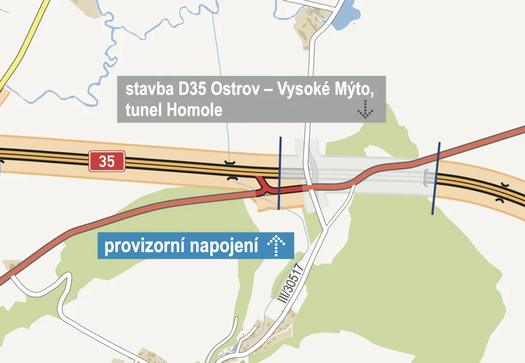 I přes zdržení na samotném tunelu se většina dálničního úseku otevře podle plánu. Od 24. srpna začnou řidiči využívat 6,2 kilometru dlouhou čtyřproudovou komunikaci od Ostrova k Vysokému Mýtu, vedoucí před a za tunelem. Doprava by se tak měla již na konci léta zcela vyhnout samotnému městu.