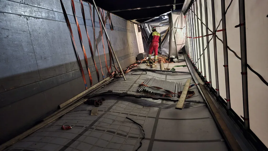 Ačkoliv byl náklad železných kulatin na návěsu řádně zajištěn upevňovacími popruhy, v důsledku havárie došlo k jeho mírnému posunu. Vzhledem k extrémní hmotnosti 22 tun oceli nebylo možné soupravu vyprostit v naloženém stavu.