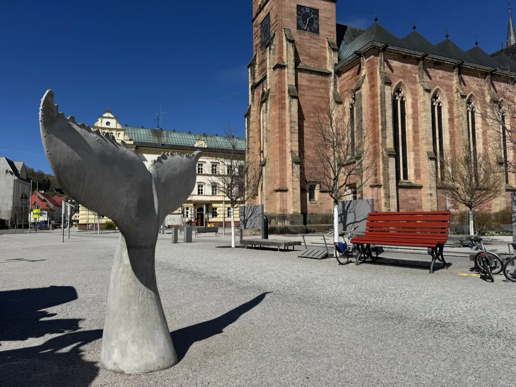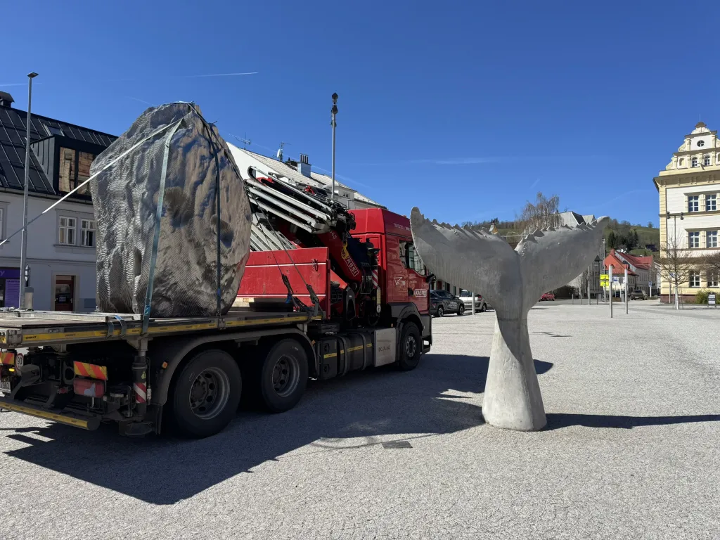 Krkonošské Vrchlabí ožilo dalším nečekaným uměleckým zjevením. Kdo v těchto dnech prochází přes kostelní náměstí Míru, nemůže přehlédnout monumentální velrybí ocas, který se symbolicky vynořuje z dláždění nedaleko otevřeného labského náhonu.