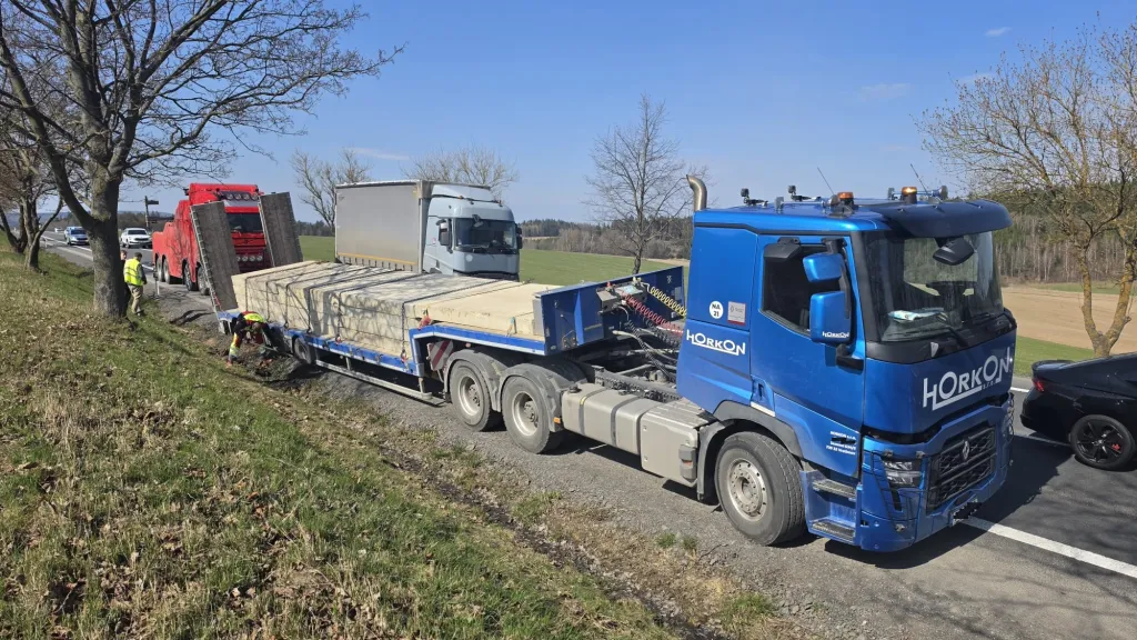 "Pomocí dvou navijáků o celkové síle 50 tun a teleskopu byl přizvednut bok návěsu s nákladem," popsal zástupce odtahové služby Via Assist. Po nezbytném nadlehčení pravé strany soupravy začal řidič Renaultu pomalu popojíždět vpřed, dokud se celý kolos nevrátil bezpečně na zpevněnou vozovku.