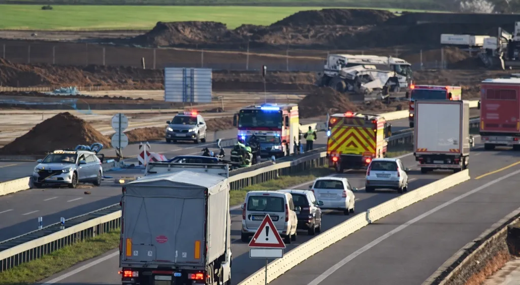 Nehoda dvou osobních aut v zúžení zkomplikovala večerní provoz na dálnici D11, jeden člověk se zranil