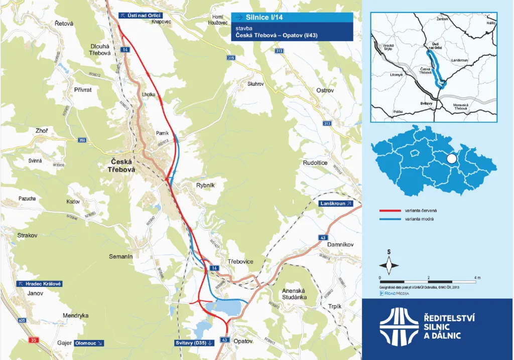 komplikuje život lidem ve městě, ale i samotným řidičům. V celé délce I/14 na území České Třebové se nenachází žádné místo, kde by bylo možné silnici překonat mimoúrovňově, což by bylo s ohledem na bezpečnost ideální. Dlouhodobě upozorňujeme na to, že obchvat města by výrazným způsobem zlepšil kvalitu života a odklonil tranzitní dopravu z centra,“ uvedl starosta České Třebové Zdeněk Řehák. Vypracovaný plán počítá se třemi variantami - červená, modrá a zelená. „Z pohledu města je jednoznačně preferovaná červená varianta, která se jeví jako ideální z hlediska dopadu do území, projednatelnosti a finanční nákladnosti. Tuto variantu budeme nadále podporovat a jsme připraveni nabídnout maximální součinnost a pomoc při všech stupních přípravy a realizace stavby,“ sdělil starosta Zdeněk Řehák.