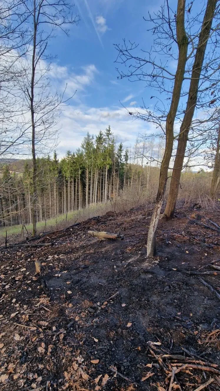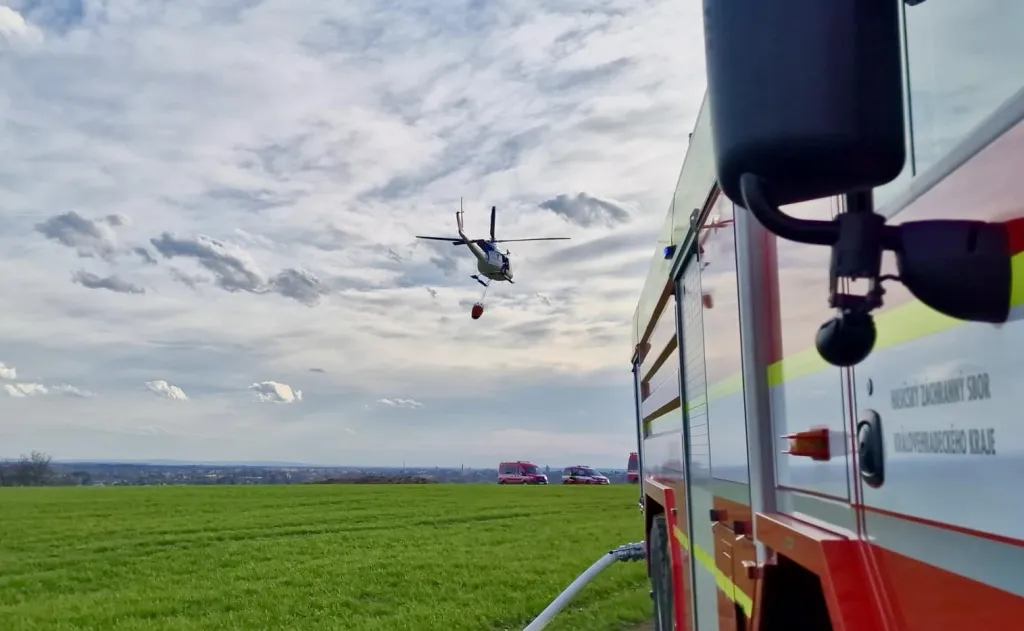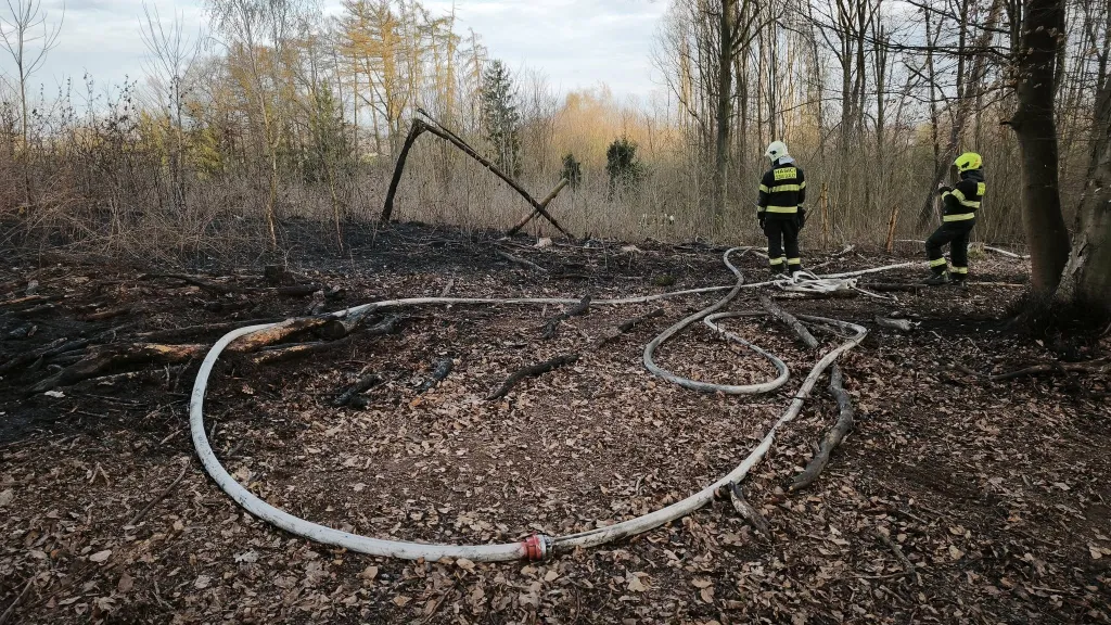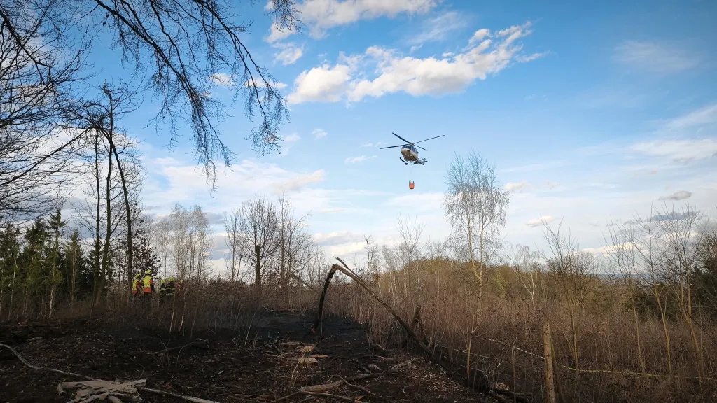 Plameny spolykaly mladé duby, zasahovat musel i vrtulník. Jeden hasič zkolaboval vyčerpáním.