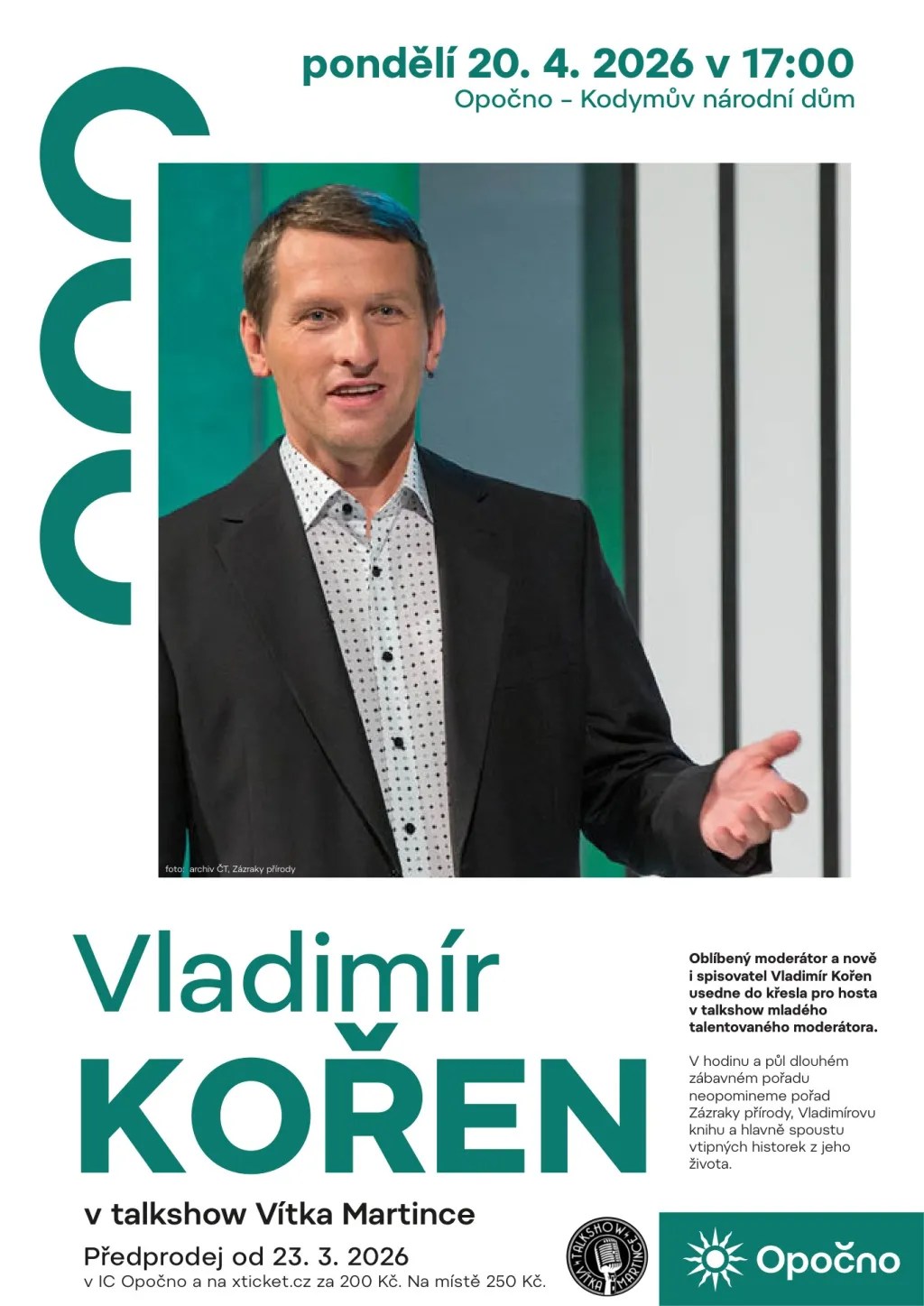 Besedu se známým moderátorem můžete navštívit v pondělí 20. dubna od 17 hodin v Kodymově národním domě. Vstupenky v předprodeji v Informačním centru Opočno a na xticket.cz za 200 Kč od 23. 3. 2026, na místě za 250 Kč.