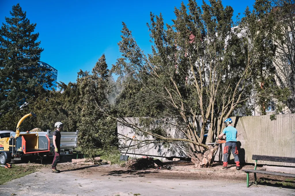 U Koruny v Hradci padl první strom, začíná velká proměna. Starý tis musel ustoupit opravám Galerie cti
