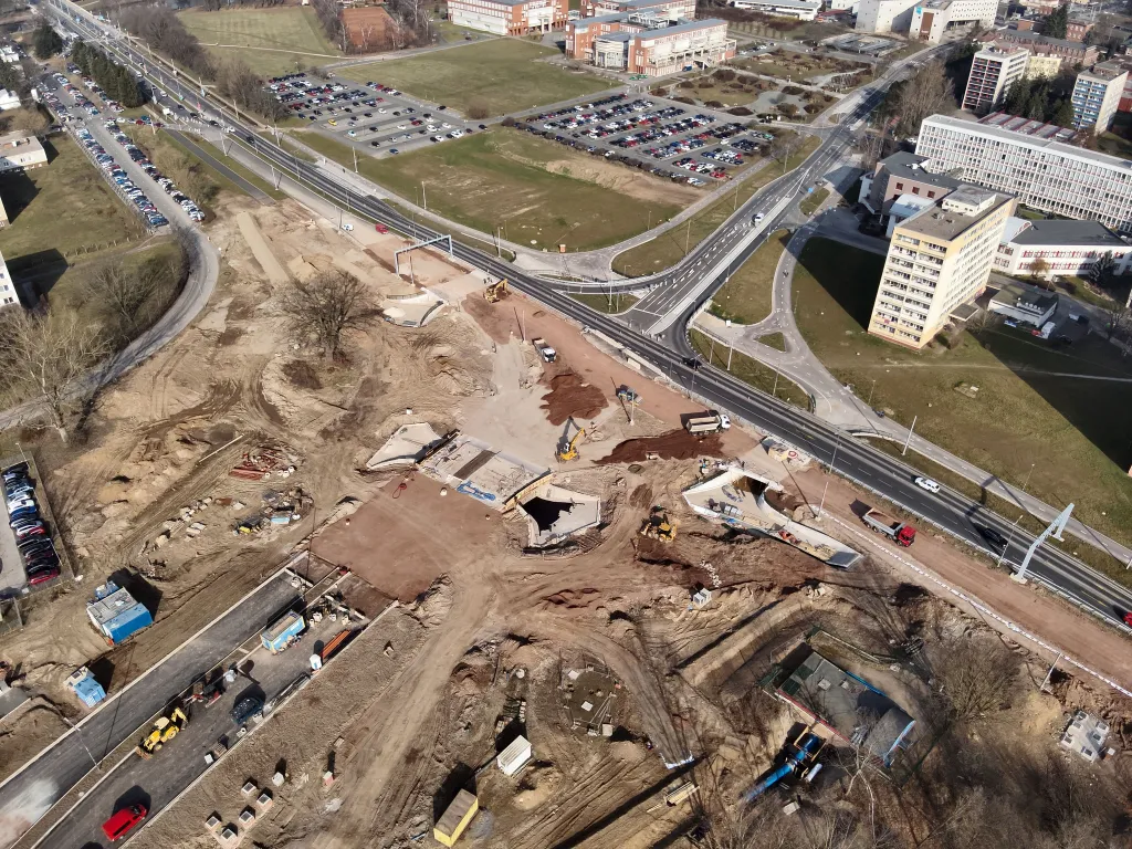 Stavbaři dokončují hlavní konstrukce podchodů. Probíhají poslední betonáže, realizují se gabionové obklady a pokračují elektroinstalační práce. Na povrchu komunikací byla upravena aktivní zóna, na kterou navazují další konstrukční vrstvy ze štěrkodrtí, přičemž v závěru měsíce dojde k pokládce mechanicky zpevněného kameniva. Současně se začínají osazovat obrubníky, díky nimž komunikace postupně získává svůj finální tvar a vzhled.