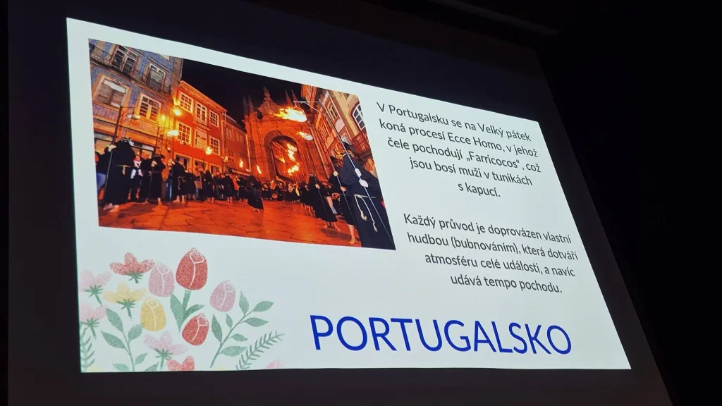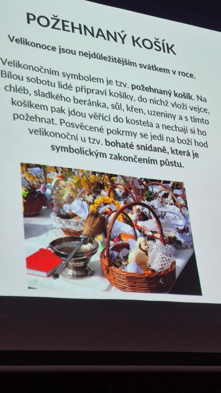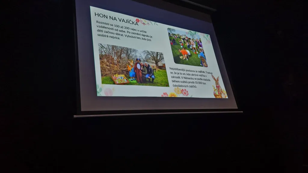 Velikonoce jsou nejvýznamnějšími jarními svátky, které se v různých zemích slaví s odlišnými tradicemi. Ty často vycházejí z pohanských i křesťanských kořenů. Mazanec, kraslice, beránek, nádivka a binovačka to jsou symboly, které dnes zná téměř každý z nás. Jak ale slaví Velikonoce naši sousedé v Evropě ? Barví a malují také vajíčka? Nebo pletou pomlázku? Paní Renata Černilovská z Eurocentra Hradec Králové seznámila přítomné diváky se zvyky v různých zemích a ochotně odpovídala na zvídavé dotazy. Vše doplnila pěknými fotografiemi nebo zajímavými videi, která ilustrovala různé zvyky. Povídání zpestřila také malým testem s odměnou.