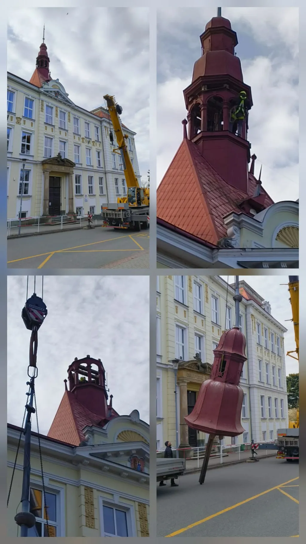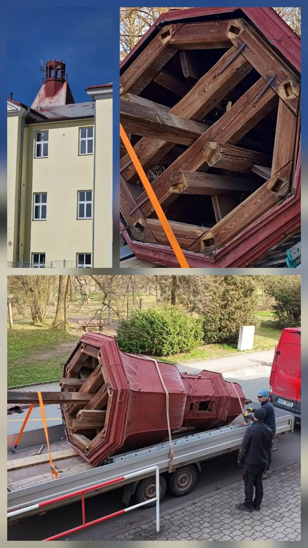 Snímky pořízené bezprostředně po snesení odhalily masivní dřevěný krov, který tvoří nosné jádro. Věžička byla následně pečlivě naložena na přívěs nákladního automobilu a řádně upevněna oranžovými popruhy pro transport. Nyní se přesouvá do specializované dílny, kde podstoupí celkovou repasi, obnovu dřevěných i klempířských prvků. Po dokončení rekonstrukce bude navrácena zpět na střešní konstrukci školy.
