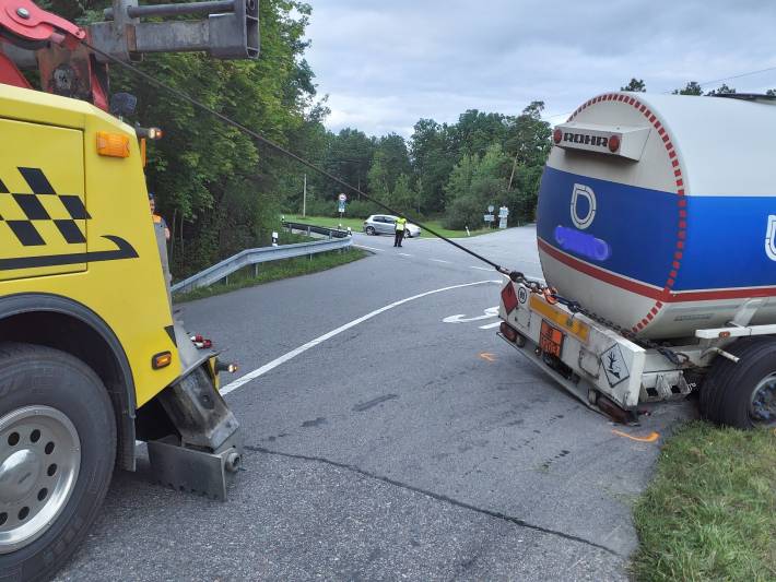 Cisterna s benzínem a naftou při výjezdu z vedlejší silnice zapadla do příkopu. Zablokovala veškerou dopravu