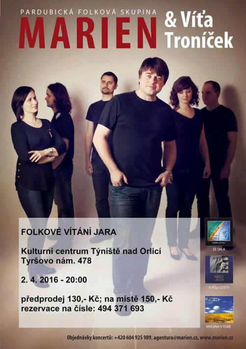 Ještě než všichni milovníci čundrů, kempování a dobré muziky vyrazí objevovat krásy letošní přírody, připravilo pro ně Kulturní centrum v Týništi nad Orlicí koncert, se kterým přivítají jaro. První týnišťské folkové vítání jara obstará pardubická skupina Marien, která vystoupí v sobotu 2. dubna v novém Kulturním domě v Týništi nad Orlicí.